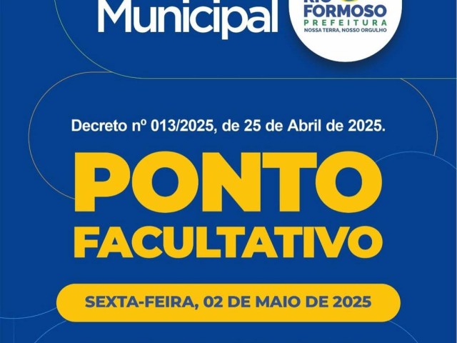 A Prefeitura do Rio Formoso informa que, em conformidade com o Decreto n° 013/2025, de 25 de abril de 2025, será ponto facultativo nesta sexta-feira (02/05) 2025.