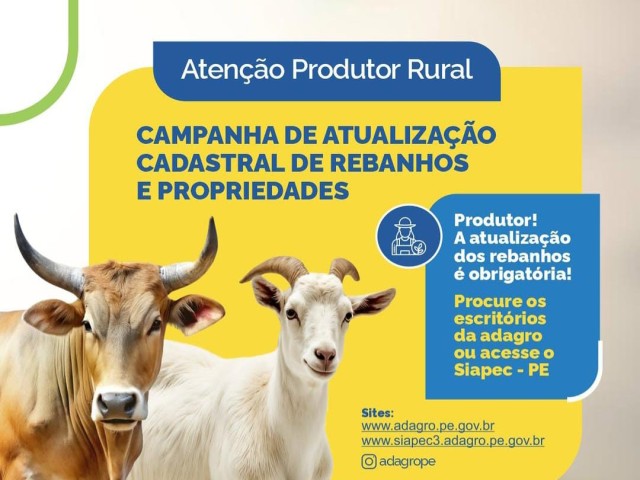 Produtor rural de Rio Formoso, atualize seu cadastro de rebanhos e propriedades! A ação é obrigatória para garantir a saúde animal. Procure a ADAGRO ou acesse www.adagro.pe.gov.br. Participe e fortaleça a produção rural do município.