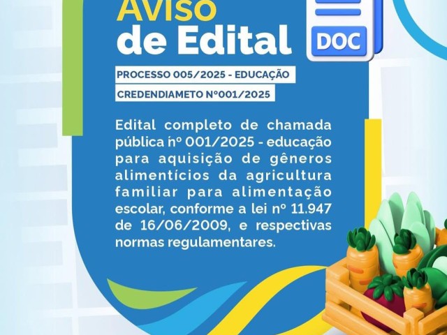 A Prefeitura de Rio Formoso abre o Edital Processo 005/2025 e Credenciamento 001/2025 para a aquisição de alimentos da agricultura familiar para a alimentação escolar. Uma chance de fortalecer a produção local e garantir qualidade aos estudantes.