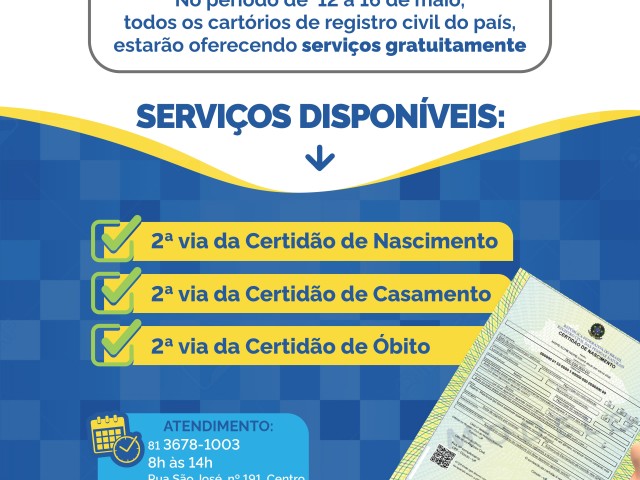 De 12 a 16 de maio, os cartórios de registro civil oferecem gratuitamente 2ª via de certidões de nascimento, casamento e óbito. Atendimento das 8h às 14h, na Rua São José, nº 191, Centro, Rio Formoso. Aproveite!